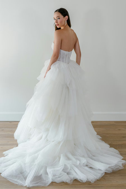 Most of our gowns are "showroom samples" from our partner boutique! When a boutique decides to part with a gown, or it is discontinued, it is sent to us to be sold as is! In each dress's listing you'll find the original retail price, measurements, and condition (aka where it is from!)