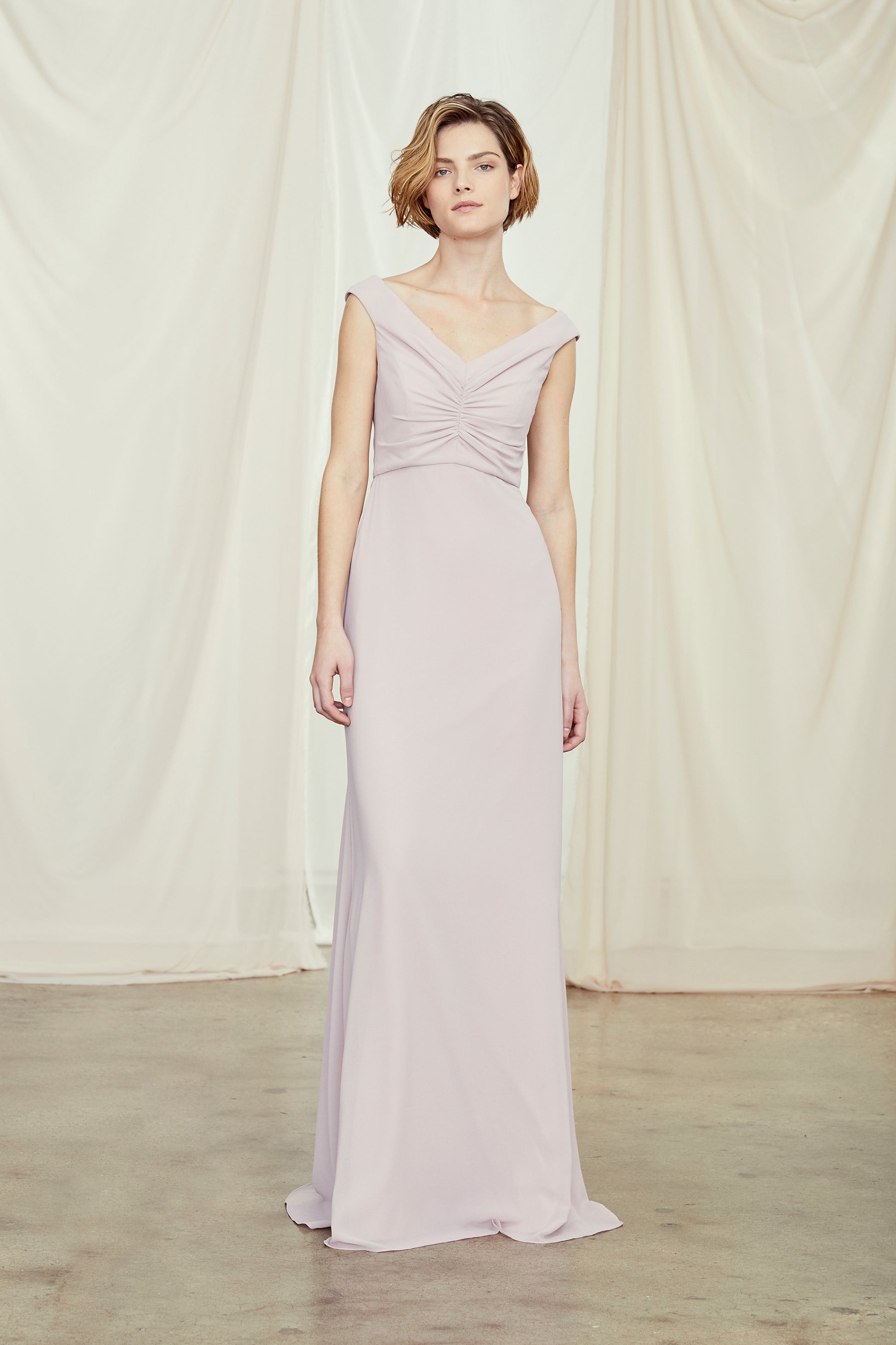 A stunning ruched sheath bridesmaid dress in a gorgeous platinum chiffon.