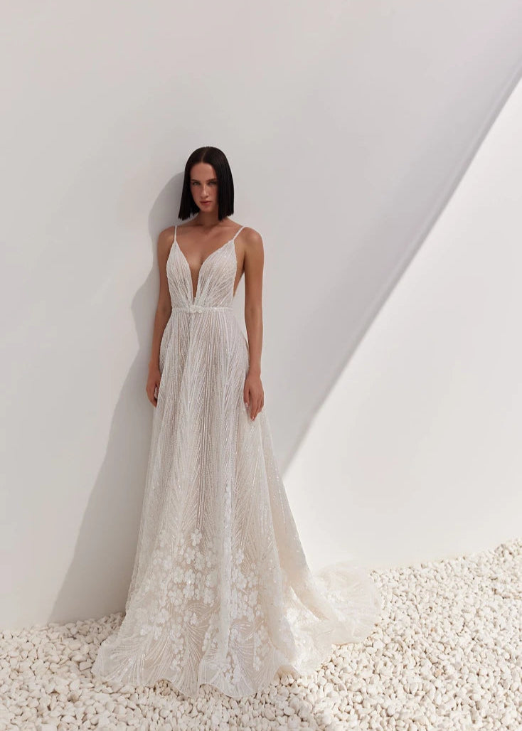 An open dress will better emphasize the perfect body. All eyes of those present at the wedding ceremony will be focused on the bride. This A-line dress in lightskin color made of embroidered lace will help to create a flawless and seductive image. The semi-transparent top with thin embroidered straps has a deep V-neck down to the waistline with a nude-colored central insert. The back of the corset is V-shaped above the waistline. The side parts of the corset are made of nude mesh, which creates the effect of nakedness. The corset is fastened in the center of the back with loops and buttons. The corset panel is decorated with diagonal drapery, visually narrowing the waist. The skirt is translucent with a small and elegant train. The top layer of the skirt is made of lace embroidered with floral patterns. The skirt is fastened in the center of the back panel with a hidden zipper. A thin, spectacular, embroidered belt with a brooch in the center of the front is sewn along the waistline of the dress. This dress can be made in ivory color and with a lining in the skirt.