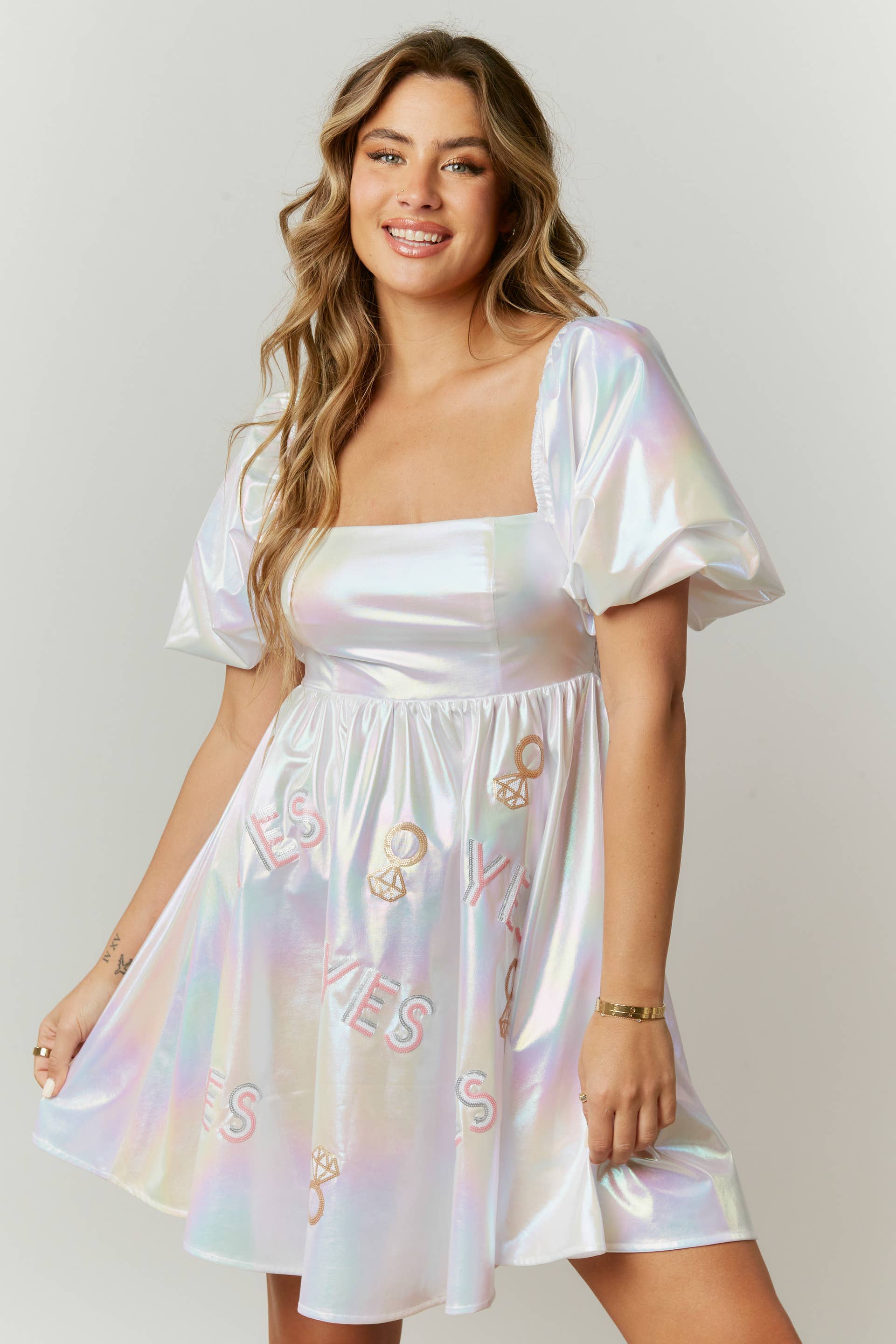 Iridescent coated mini dress with allover yes bridal ring patches
