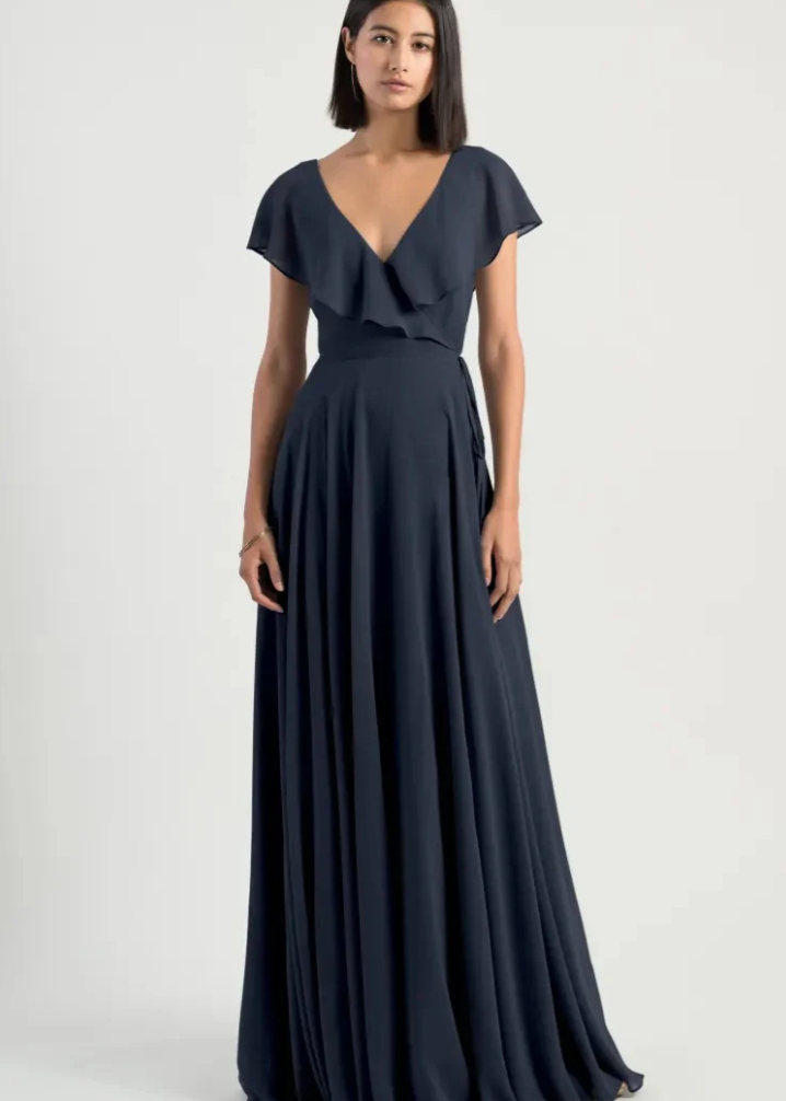 The Faye chiffon wrap dress is effortlessly romantic. This true wrap dress has a soft ruffle and flutter sleeve that offers the perfect amount of arm coverage. The waist is adjustable for an easy fit, and the full circle skirt offers graceful movement.