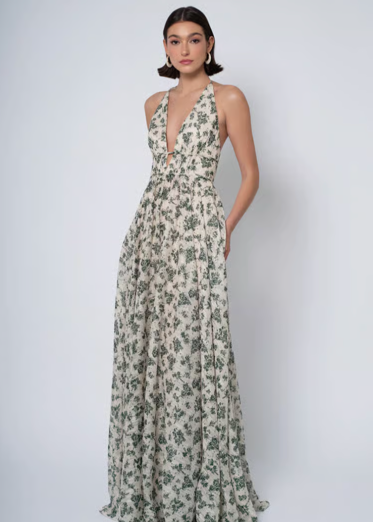 The Robin dress is cut in a beautifully textured chiffon printed with an allover scatter of wildflowers in a beautiful deep green color. Her halter neckline plunges to a flattering cummerbund style waist with a full flowing A-line skirt.