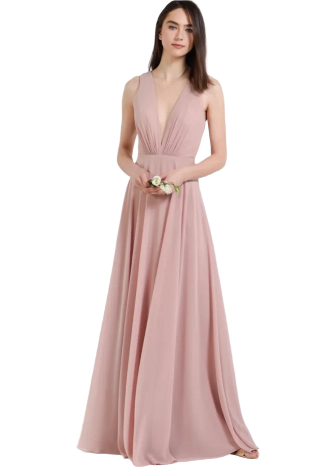 The Ryan chiffon bridesmaid dress features a daring plunging V-neck. Not to worry, the nearly invisible illusion insert holds you in. The bodice is delicately pleated, and the circle cut skirt moves beautifully.