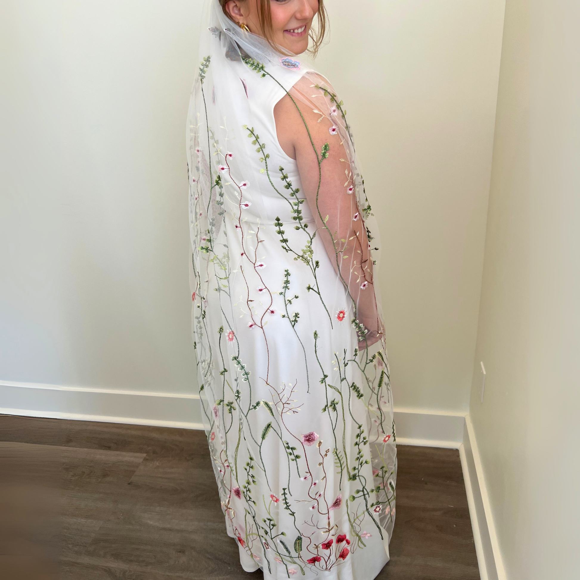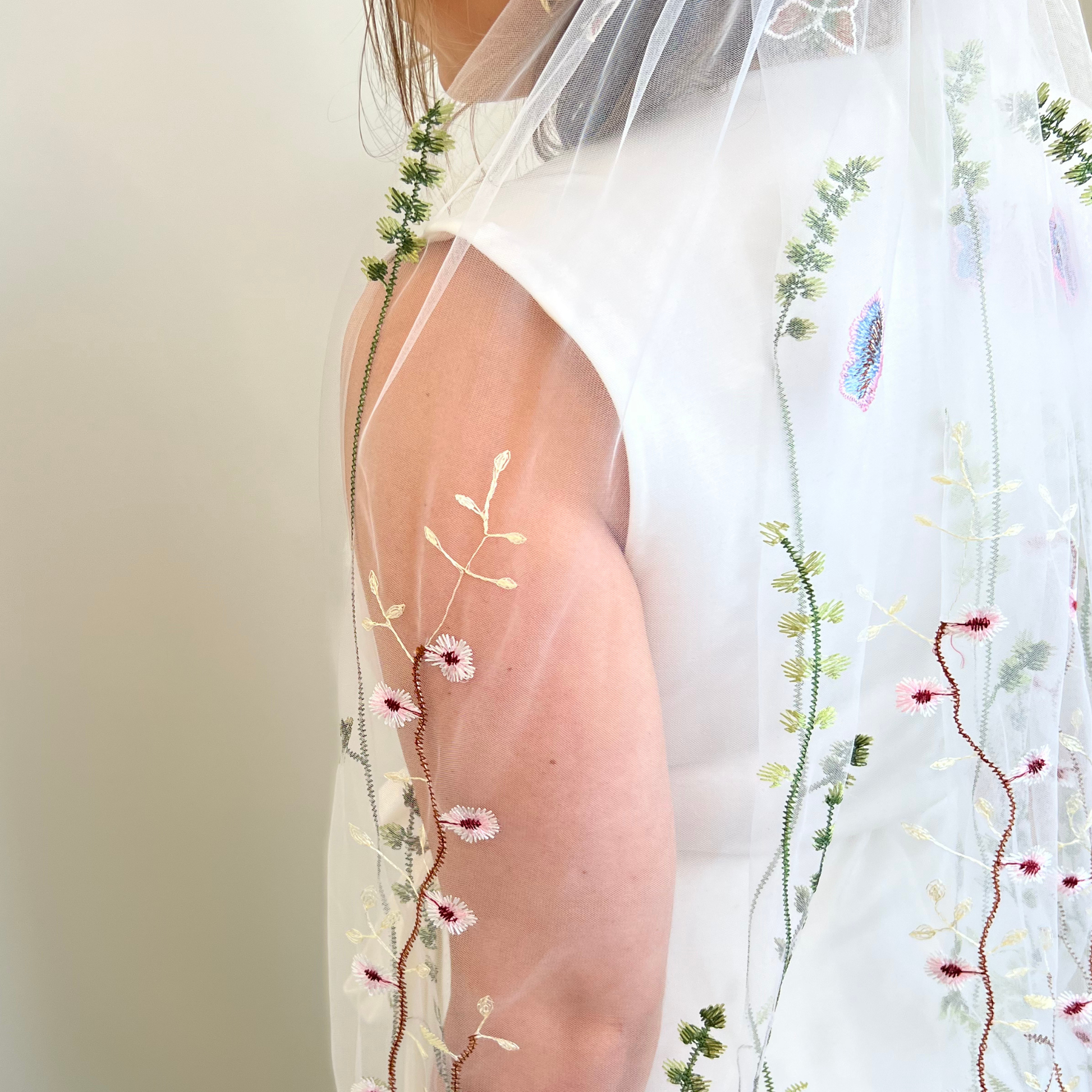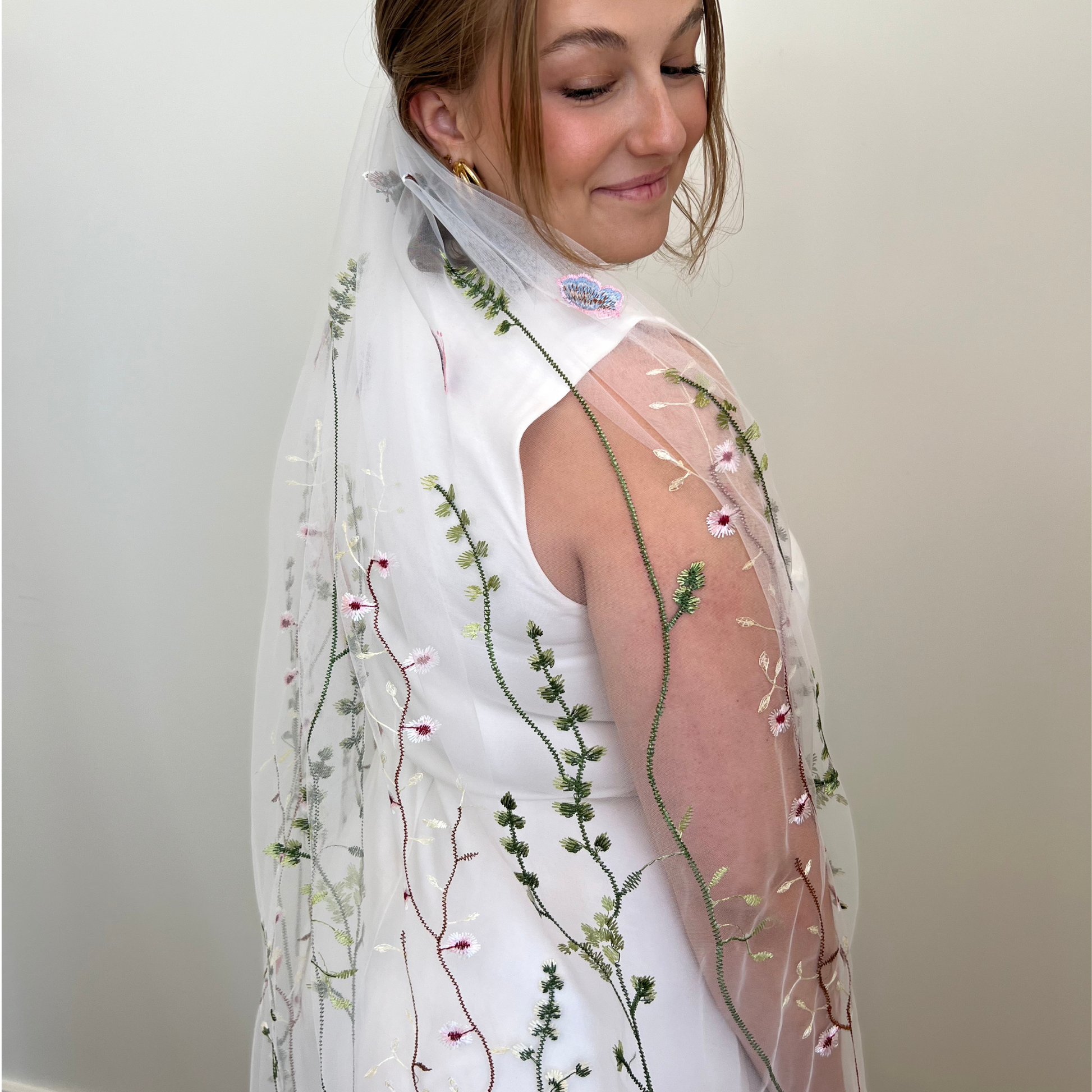 Earthy, romantic, and beautifully detailed — this Wildflower Veil is a nature-inspired masterpiece for the modern bride. Crafted from lightweight tulle it’s embroidered with cascading red and green wildflower vines that create a stunning texture as they flow down the veil.