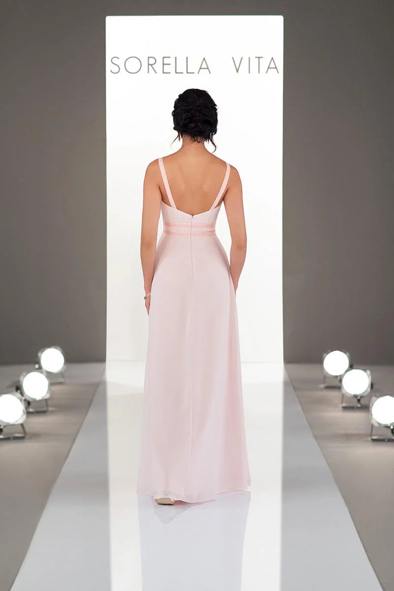 Chic, modern and sexy—with a twist! A classic sheath silhouette with subtle sweetheart neckline, this chiffon bridesmaid gown features a double velvet waistband that creates an enviable feminine shape—while velvet straps grace the shoulders for a subtle sexiness. Sleek and totally on-trend, bridesmaids will love rocking this mixed-material gown again and again—on the wedding day and beyond!