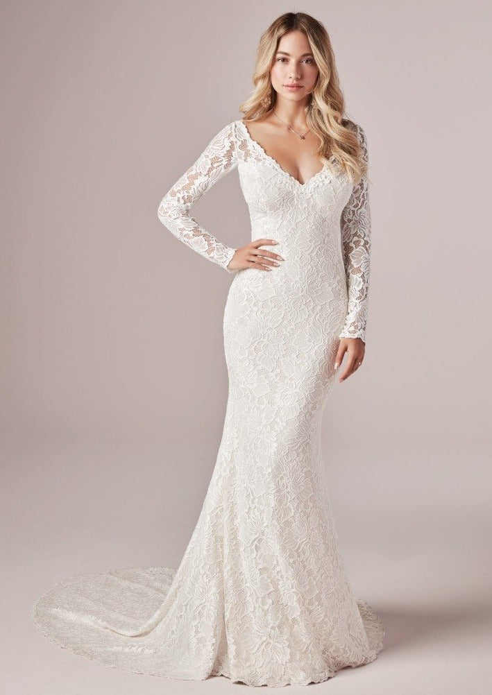 Lace on the Tina Dawn is a total classic. Amp up the charm with illusion details and a super sexy neckline. It’s easy-breezy in this long-sleeved sheath wedding dress in boho-inspired lace.