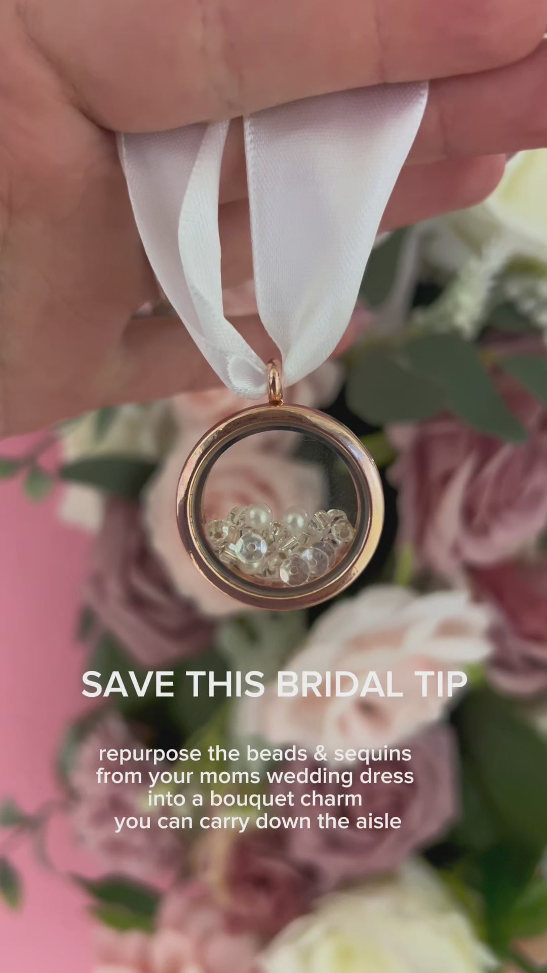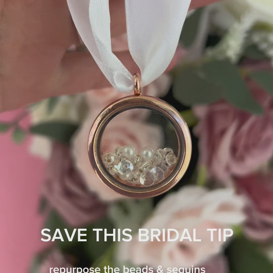 The Bouquet charm is an easy and cost friendly way to take any part of your wedding dress and transform it into a heirloom keepsake that will be able to be used in MULTIPLE weddings!